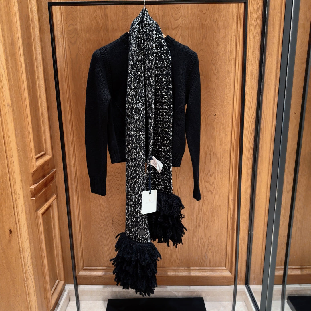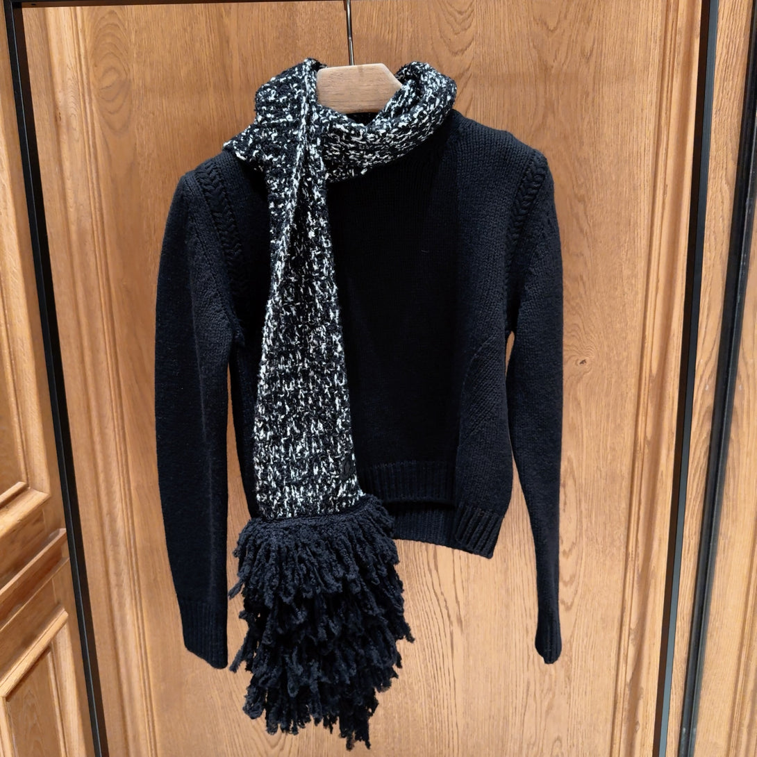 A study in sophisticated textures, this women's scarf pairs mouliné wool with a fringe trim.
