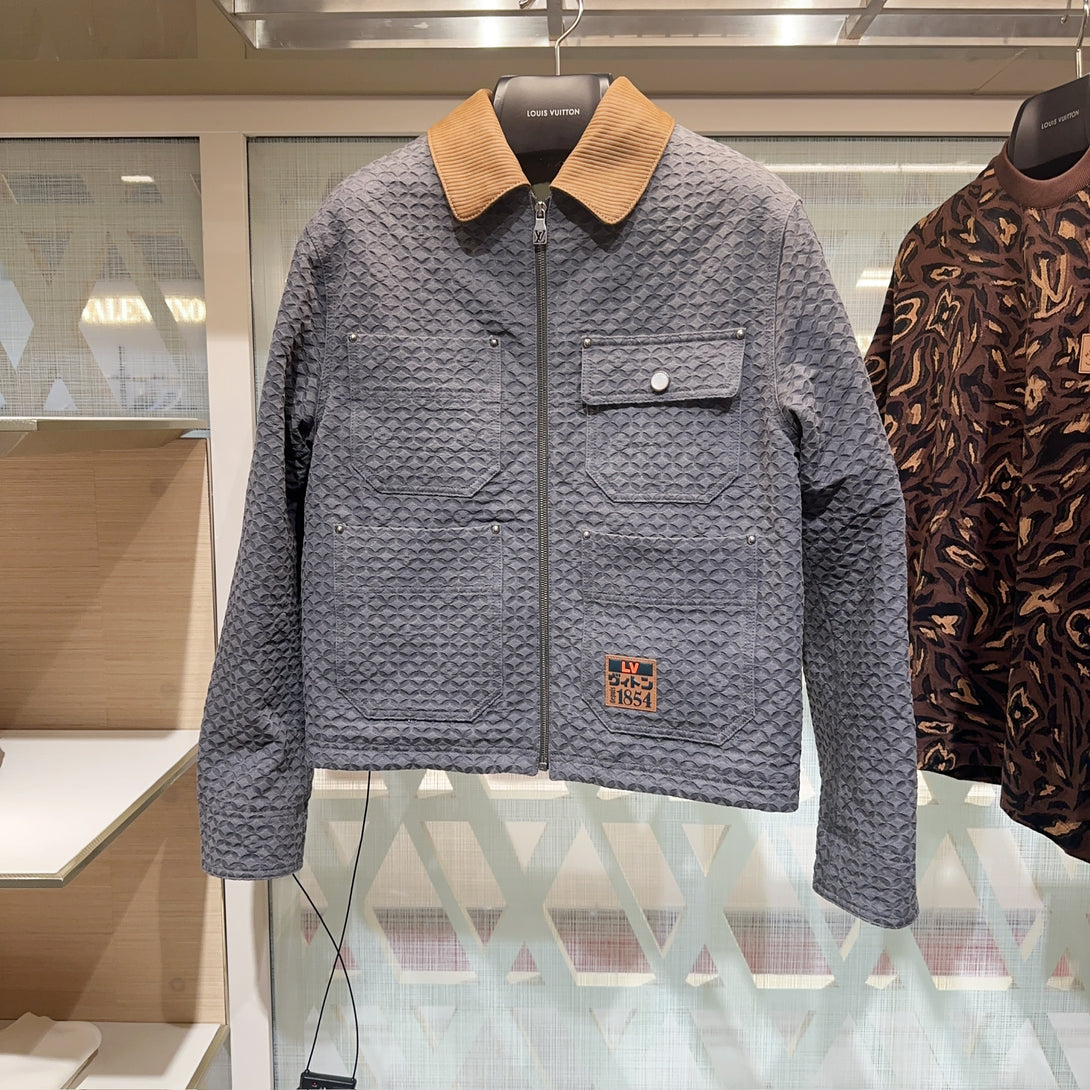 This dark gray organic cotton workwear jacket is adorned with a jacquard Dandy Monogram motif with a textured finish from the Fall-Winter 2025 show. It has a brown leather corduroy-effect collar while a leather Marque L.Vuitton Déposée patch adorns one of the four riveted patch pockets. A lightly quilted interior makes this versatile across seasons. Matching pants make a casual yet distinguished set.