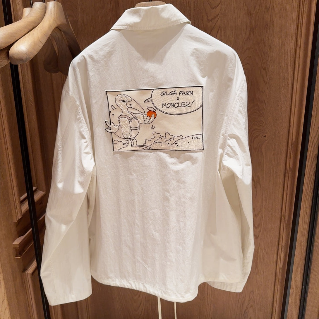 Cartoon-style depictions of the iconic Mon Duck character animate the men's Moncler x Gilga Farm by Donald Glover Satsuma shirt jacket.