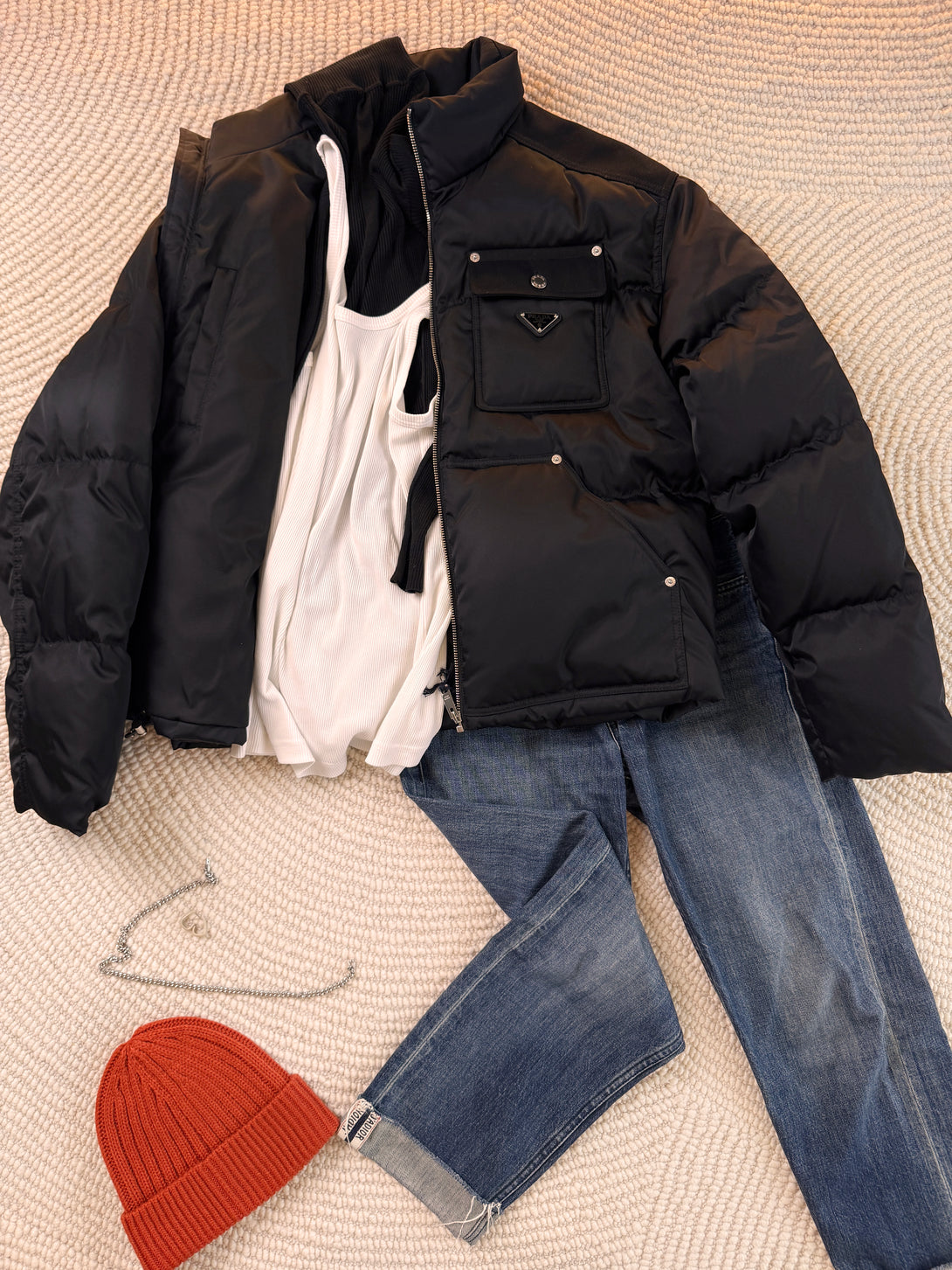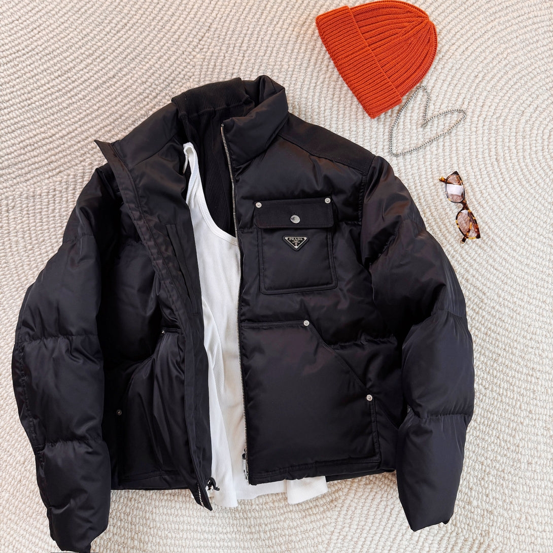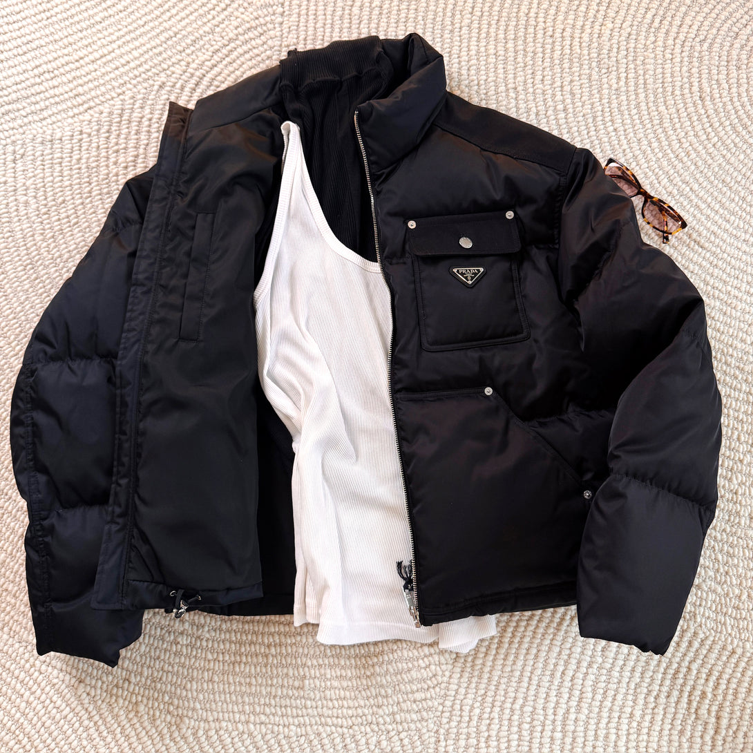 This down jacket with enveloping volumes and a sporty, functional design is made of Re-Nylon. The innovative fabric made of regenerated nylon enhances the contemporary and pragmatic character of the style, completed with warm goose down padding and enriched by the distinctive signature touch of the enameled metal triangle logo.